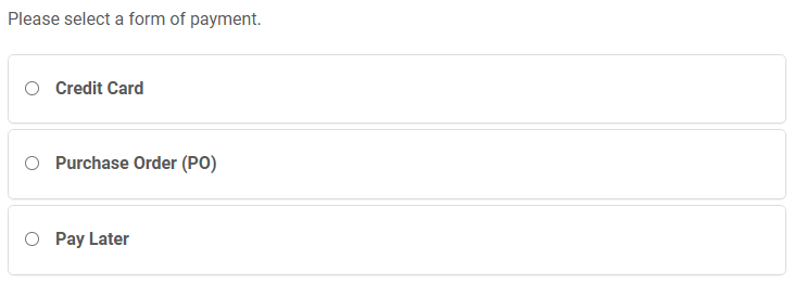 Credit card information can be entered during the checkout process or added after an order has been submitted if the original payment method was a Purchase Order (PO).